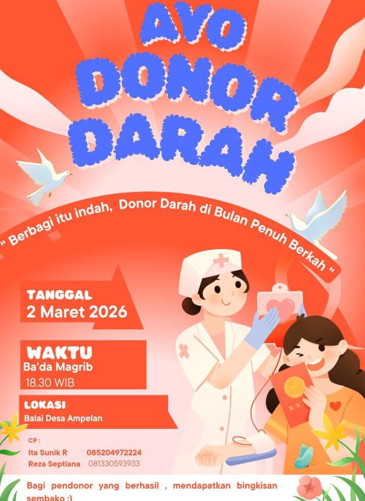 Bondowoso, Nusantarapost.id – Dalam rangka meningkatkan kepedulian dan kesehatan masyarakat, Desa Ampelan, Kecamatan Wringin bekerja sama dengan Palang Merah Indonesia (PMI) Kabupaten Bondowoso akan menggelar donor darah pada 2 Maret di Desa Ampelan, setelah Magrib, dengan tema “Berbagai Itu Indah Donor Darah di Bulan Penuh Berkah”.