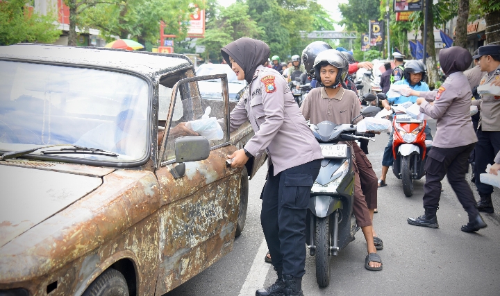 Jajaran Polisi Wanita (Polwan) Polres Bondowoso menggelar aksi sosial dengan membagikan 500 paket takjil kepada pengguna jalan, pedagang, dan juru parkir di sekitar Pasar Induk Bondowoso. Kegiatan tersebut dipimpin oleh IPDA Otty Diana Novita selaku Pembina Polwan Polres Bondowoso bersama personel lainnya.
