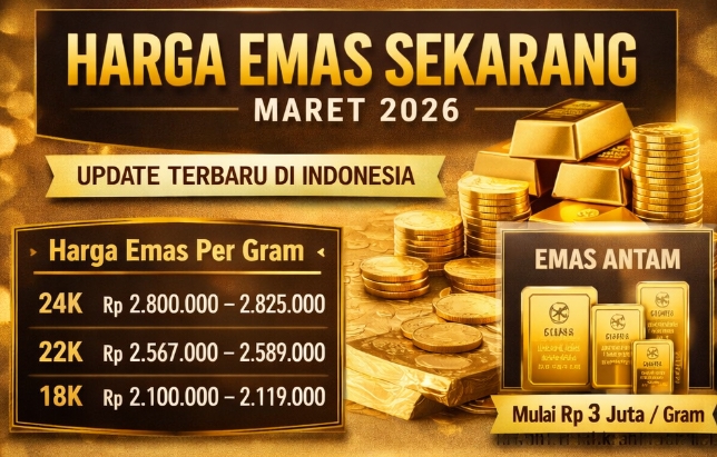 Harga emas di Indonesia pada Maret 2026 menunjukkan tren kuat di kisaran Rp2,5 juta – Rp2,8 juta per gram untuk emas murni (24K) dan bervariasi sesuai kadar emas. Harga emas batangan bisa mencapai sekitar Rp3 jutaan per gram tergantung pecahan. Harga emas sangat dinamis dan dipengaruhi oleh faktor global serta lokal seperti nilai tukar dan permintaan investornya.