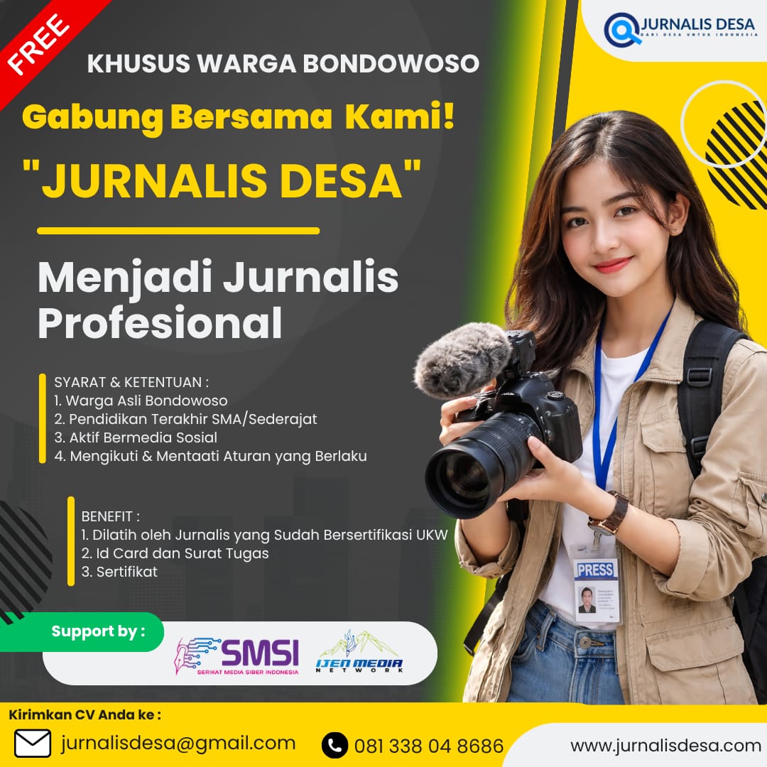 Bondowoso, Nusantarapost.id – Platform media JurnalisDesa.com resmi membuka pendaftaran pelatihan jurnalis gratis khusus bagi warga Bondowoso. Program ini merupakan inisiatif dari Serikat Media Siber Indonesia (SMSI) Bondowoso sebagai upaya mencetak jurnalis desa yang profesional, kompeten, dan mampu menyajikan informasi yang akurat serta bermanfaat bagi masyarakat.